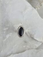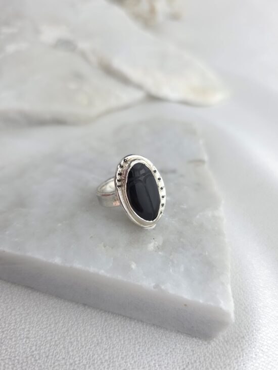 Αυτό το δαχτυλίδι από ασήμι 925 διαθέτει μια κεντρική, οβάλ πέτρα με μαύρο όνυχα και περιβάλλεται από μικρά μαύρα σπινέλ. Το σχέδιό του αποπνέει δυναμισμό και κλασική αισθητική, ενώ το περίτεχνο καστόνι προσθέτει μια vintage πινελιά. Είναι ένα κόσμημα που μπορεί να ολοκληρώσει με στυλ κάθε εμφάνιση.