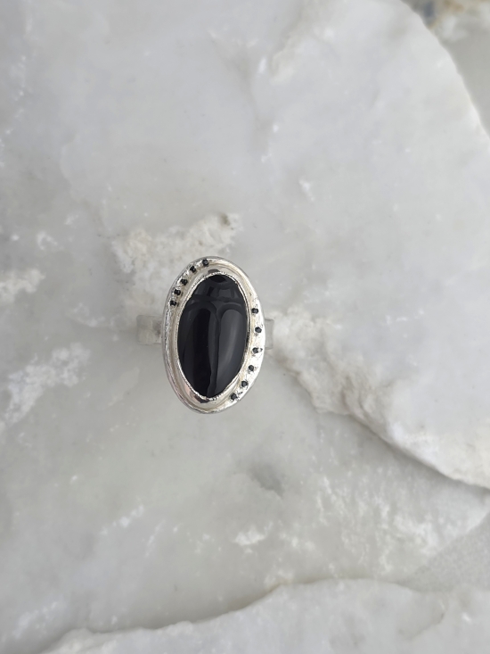 Εντυπωσιακό δαχτυλίδι από ασήμι 925, με μαύρο όνυχα και μαύρα σπινέλ.