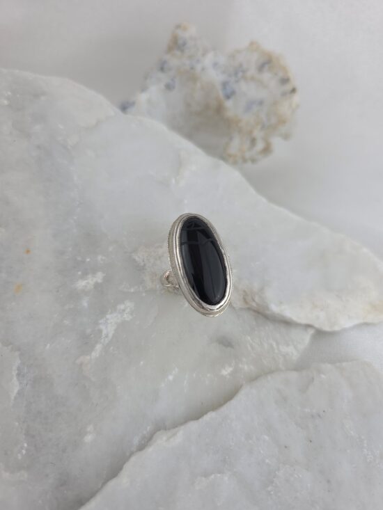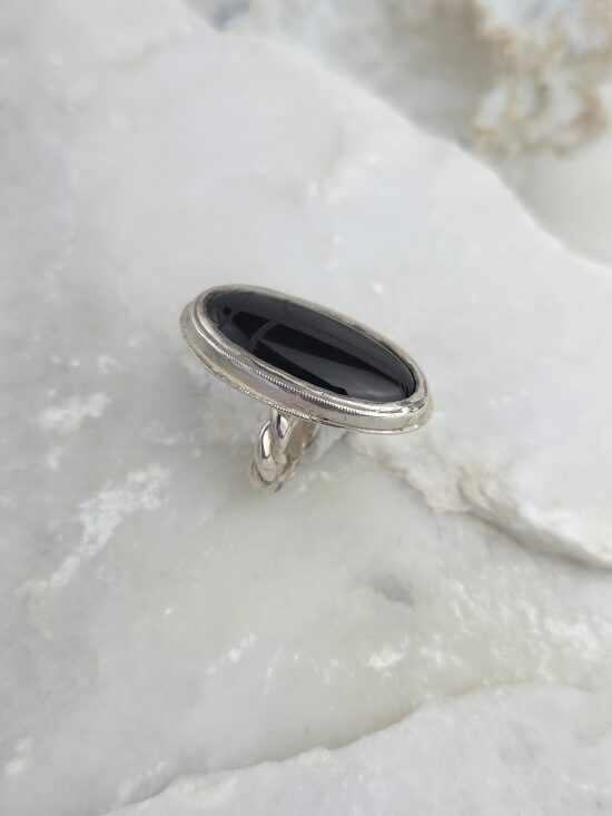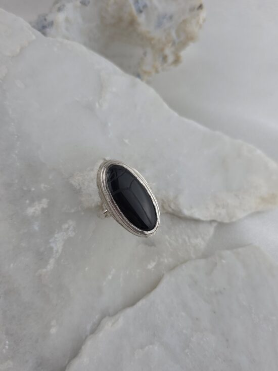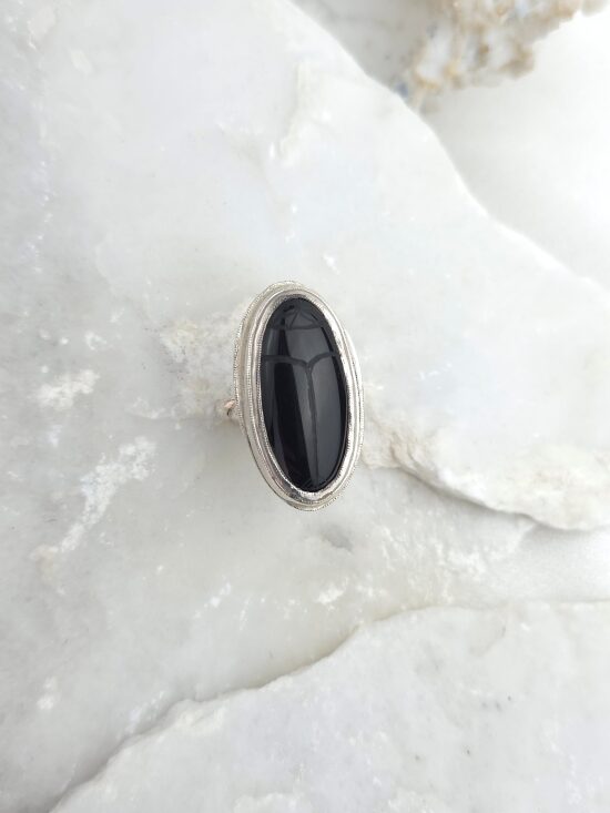 Αυτό το διαχρονικό δαχτυλίδι από ασήμι 925, διαθέτει έναν οβάλ μαύρο όνυχα σε σχήμα σκαραβαίου σκαλισμένο στο χέρι. Ο μαύρος όνυχας είναι γνωστός ως η πέτρα της προστασίας, που πιστεύεται ότι απορροφά την αρνητική ενέργεια και ενισχύει τη δύναμη του ατόμου που το φοράει. Πρόκειται για ένα κόσμημα που σίγουρα θα ξεχωρίσει στη συλλογή σας.
