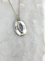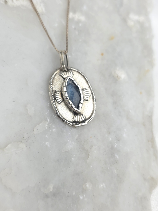 Εντυπωσιακό και ιδιαίτερο κρεμαστό από ασήμι 925 με φυσικό μπλε κυανίτη. Συνοδεύεται από αλυσίδα από ασήμι 925.