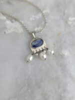 Αυτό το χειροποίητο κρεμαστό  από ασήμι 925 διαθέτει έναν εντυπωσιακό οβάλ κυανίτη σε βαθύ μπλε χρώμα, που αιχμαλωτίζει το φως. Συνδυασμένος από λαμπερά φυσικά μαργαριτάρια, τα οποία κρέμονται απαλά, προσθέτοντας κίνηση και φινέτσα. Ένα κόσμημα που ξεχωρίζει για τον οργανικό του σχεδιασμό και την αρμονική συνύπαρξη των υλικών του.