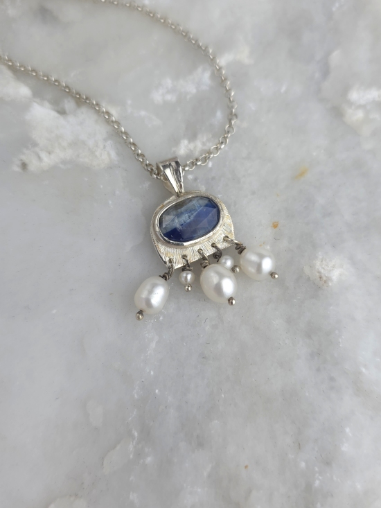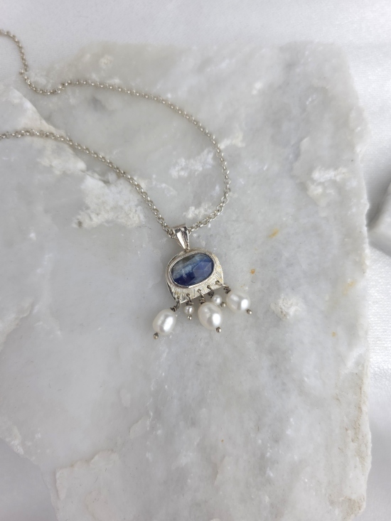 Χειροποίητο κρεμαστό από ασήμι 925 με φυσικό μπλε κυανίτη και φυσικά μαργαριτάρια. Συνοδεύεται από αλυσίδα από ασήμι 925.