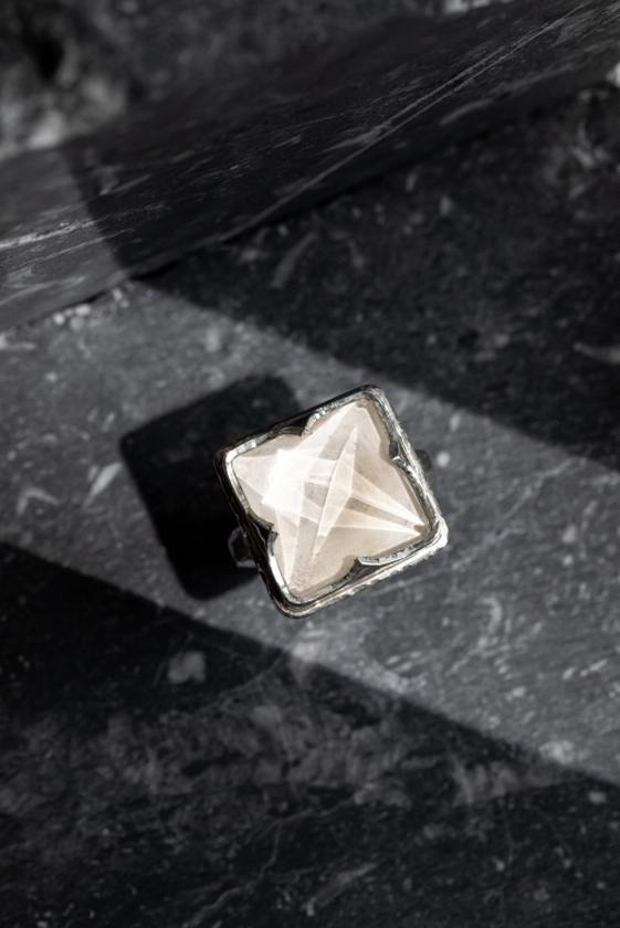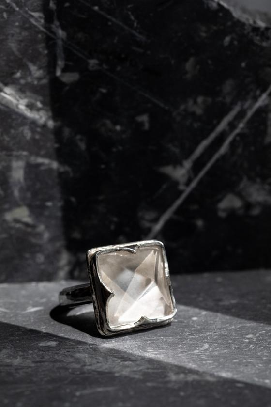 Δαχτυλίδι πυραμίδα με φυσικό quartz κοπής σε σχήμα πυραμίδα σε περίτεχνο σχέδιο.