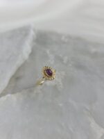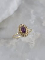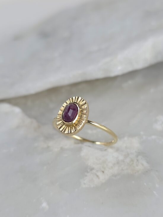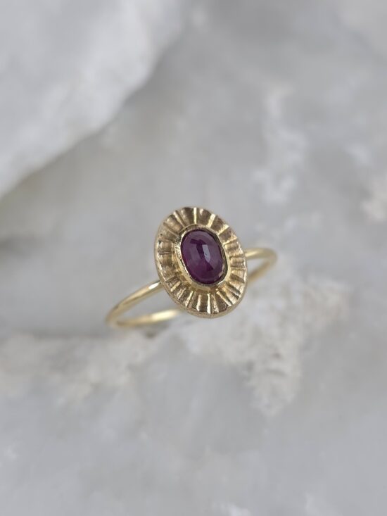 Αυτό το εκλεπτυσμένο δαχτυλίδι σε χρυσό Κ14 αναδεικνύει τη διαχρονική ομορφιά του χρυσού, πλαισιώνοντας ένα βαθύ κόκκινο φυσικό ρουμπίνι που αιχμαλωτίζει το βλέμμα. Η λεπτή, σκαλιστή ροζέτα γύρω από την πέτρα θυμίζει ακτίνες ηλίου, προσδίδοντας μια μοναδική, vintage γοητεία. Είναι το ιδανικό κόσμημα για να προσθέσετε μια διακριτική νότα πολυτέλειας και κομψότητας σε κάθε εμφάνιση.