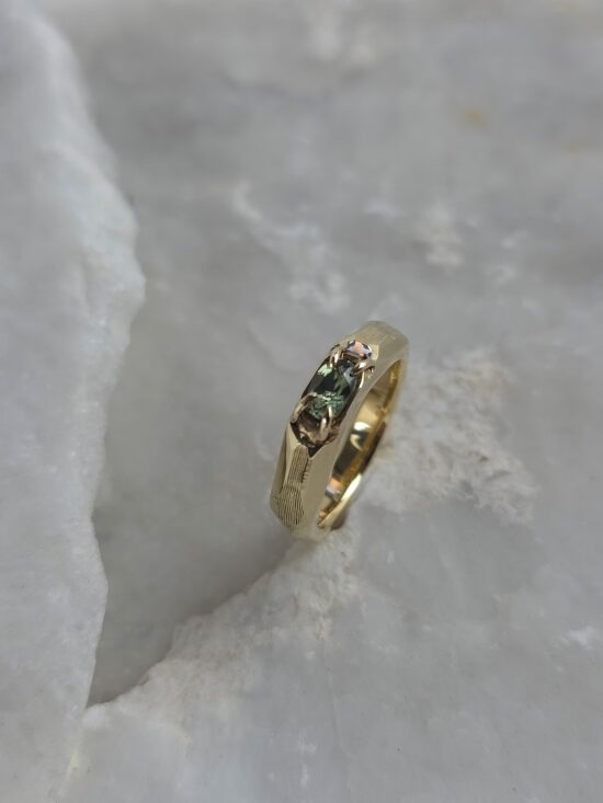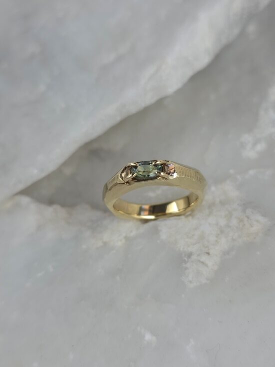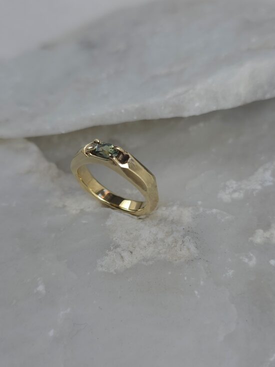 Δαχτυλίδι γεωμετρικού σχεδιασμού σε χρυσό Κ14 , με φυσικό ζαφείρι σε πράσινη απόχρωση.