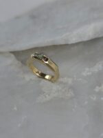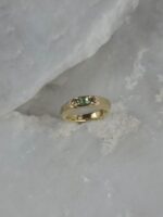 Αυτό το εκπληκτικό δαχτυλίδι από χρυσό Κ14 με φυσικό ζαφείρι σε πράσινη απόχρωση, αποτελεί μια αρμονική συνάντηση της σύγχρονης δεξιοτεχνίας και του ανεπιτήδευτου, οργανικού σχεδιασμού. Η απαλή, κυρτή εσωτερική γραμμή εξασφαλίζει άνετη εφαρμογή, ενώ η ανακλαστική του επιφάνεια αιχμαλωτίζει το φως με έναν διακριτικό, αλλά αδιαμφισβήτητο τρόπο. Είτε φορεθεί μόνο του ως μια τολμηρή δήλωση προσωπικότητας είτε συνδυαστεί με άλλα κοσμήματα, αυτό το δαχτυλίδι είναι μια ευέλικτη και διαχρονική προσθήκη σε κάθε συλλογή. Είναι ιδανικό για όσους αναζητούν ένα κόσμημα που είναι ταυτόχρονα κλασικό και διακριτικά διαφορετικό.