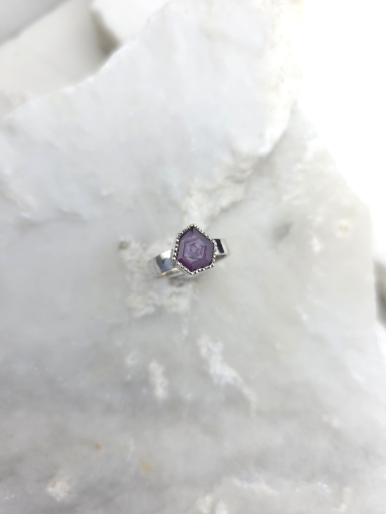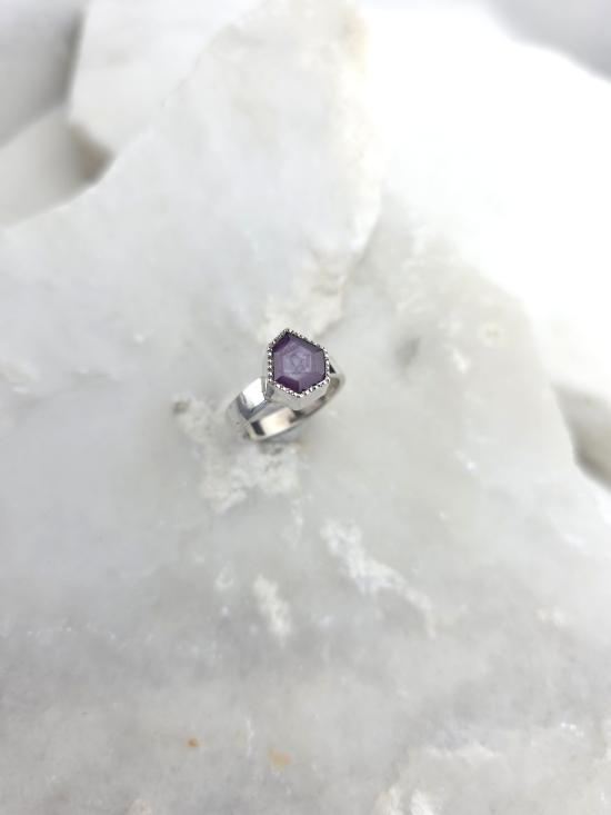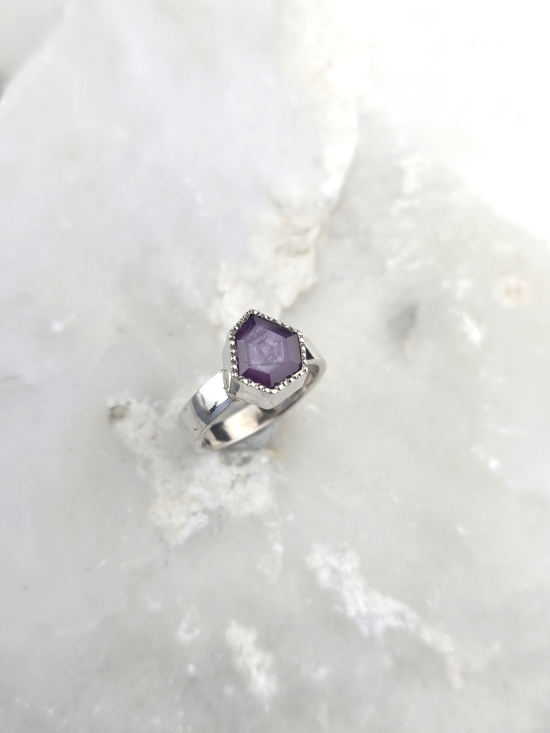 Εντυπωσιακό δαχτυλίδι από ασήμι 925 με φυσικό μωβ ζαφείρι. Το βαθύ μωβ χρώμα και το εξάγωνο σχήμα της πέτρας κάνουν αυτό το κόσμημα να ξεχωρίζει. Ένα statement δαχτυλίδι, ιδανικό για όσους αναζητούν ένα κόσμημα με χαρακτήρα.