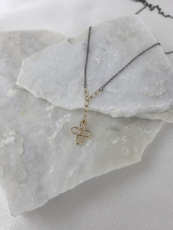 Δώσε δυναμισμό και κομψότητα στο στυλ σου με αυτό το εντυπωσιακό κρεμαστό με τον ιδιαίτερο χρωματικό συνδυασμό του χρυσού με το μαύρο. Το γεωμετρικό στοιχείο αναδεικνύει τη minimal chic αισθητική του. Κατασκευασμένο από χρυσό Κ14 και συνδυασμένο με οξειδωμένη αλυσίδα από ασήμι 925.