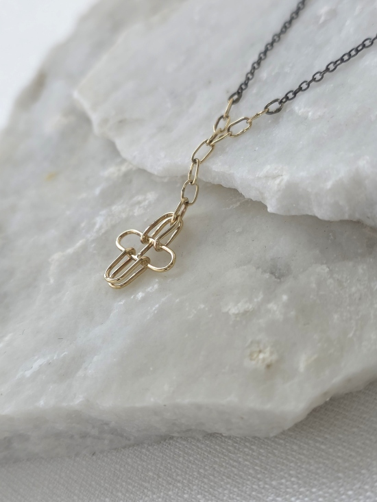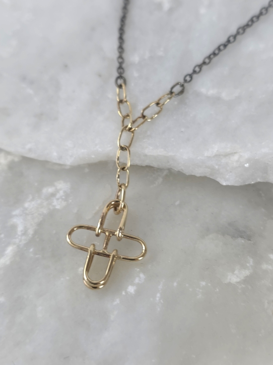 Μοντέρνος και ξεχωριστός σταυρός από χρυσό Κ14. Συνοδεύεται από οξειδωμένη αλυσίδα από ασήμι 925.