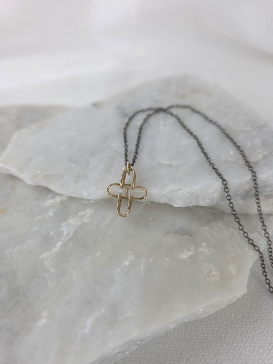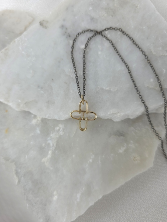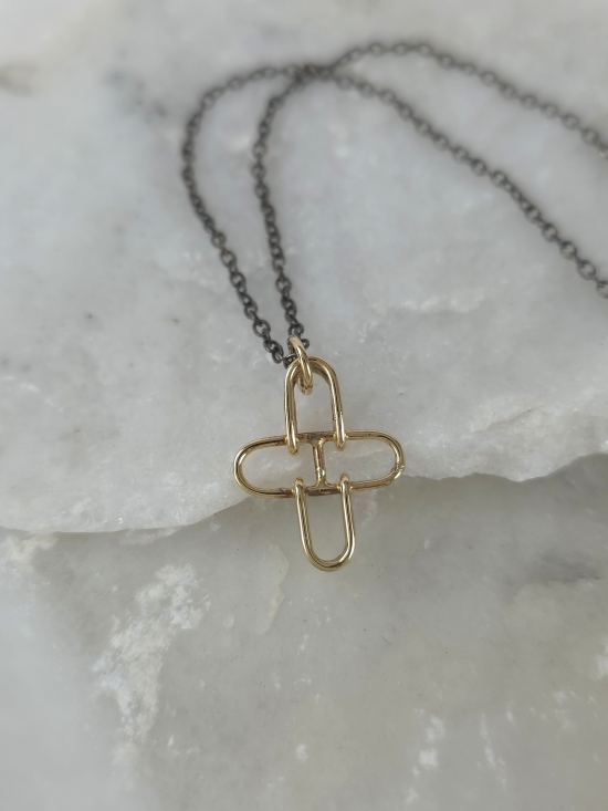 Δώσε δυναμισμό και κομψότητα στο στυλ σου με αυτό το εντυπωσιακό κρεμαστό με τον ιδιαίτερο χρωματικό συνδυασμό του χρυσού με το μαύρο. Το γεωμετρικό στοιχείο αναδεικνύει τη minimal chic αισθητική του. Κατασκευασμένο από χρυσό Κ14 και συνδυασμένο με οξειδωμένη αλυσίδα από ασήμι 925.
