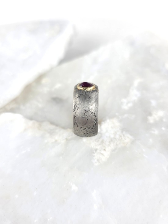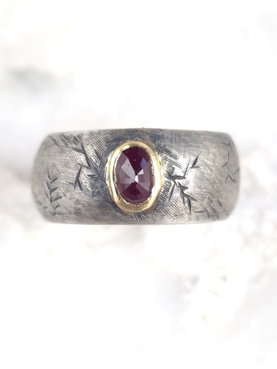 Εντυπωσιάστε με αυτό το χειροποίητο δαχτυλίδι σε ασήμι 925 και χρυσό Κ14, το οποίο ξεχωρίζει για την κομψή του αισθητική και τον προσεγμένο του σχεδιασμό. Στο κέντρο δεσπόζει ένα βαθύ κόκκινο ρουμπίνι, που μαγνητίζει τα βλέμματα με τη ζωντάνια του. Η βάση του δαχτυλιδιού είναι διακοσμημένη με ανάγλυφα σχέδια φύλλων, προσδίδοντας μια φυσική και ντελικάτη όψη. Η οξείδωση έρχεται σε αντίθεση με το χρυσό καστόνι που αγκαλιάζει την πέτρα, δίνοντας μία πινελιά πολυτέλειας και κομψότητας.