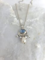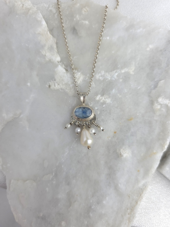 Διαχρονικό κρεμαστό από ασήμι 925, με φυσικό μπλε κυανίτη και φυσικά μαργαριτάρια. Συνοδεύεται από αλυσίδα από ασήμι 925.