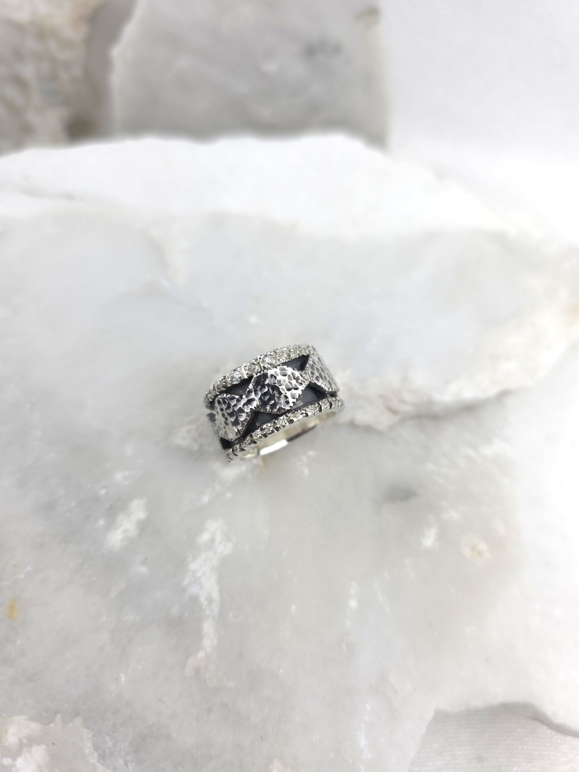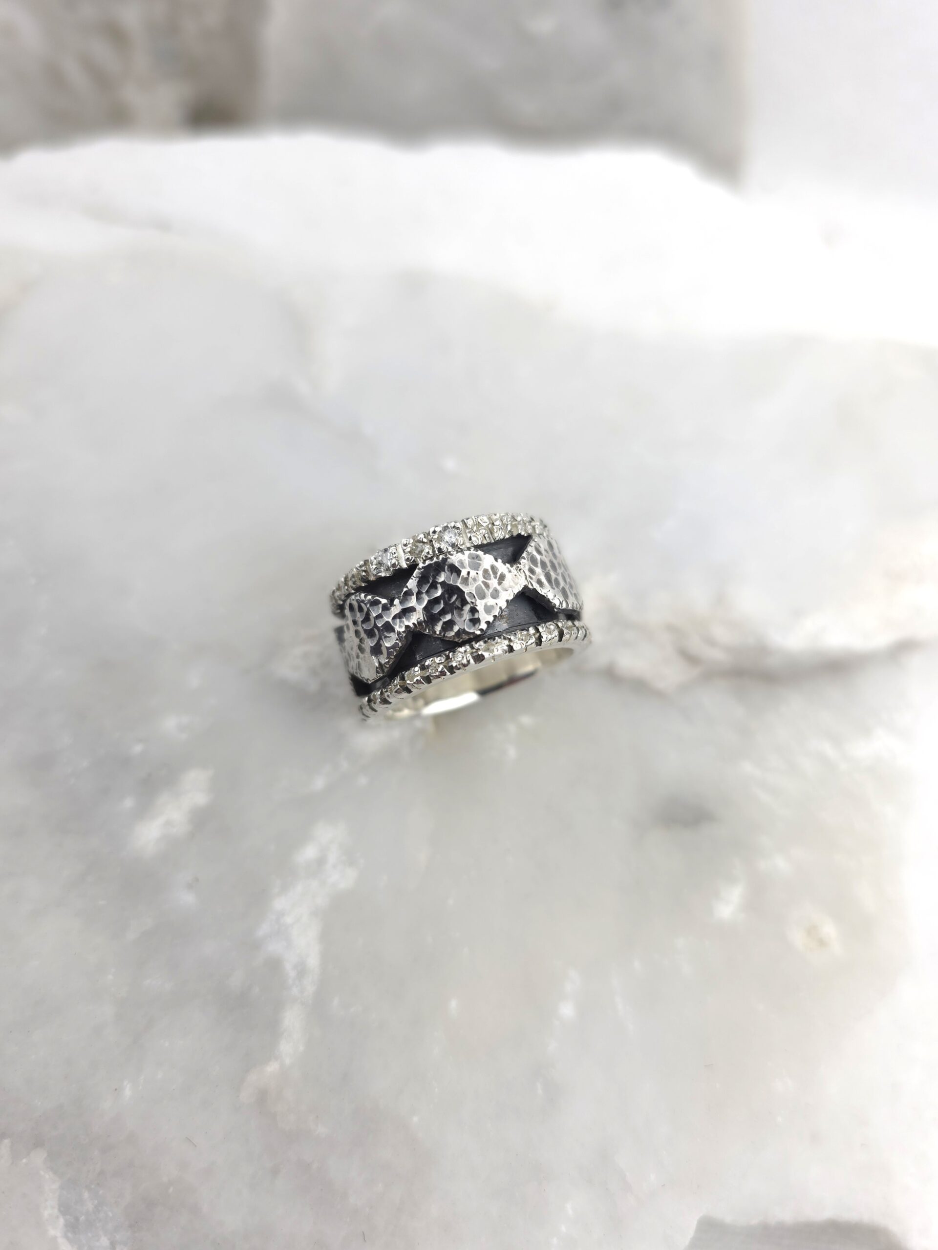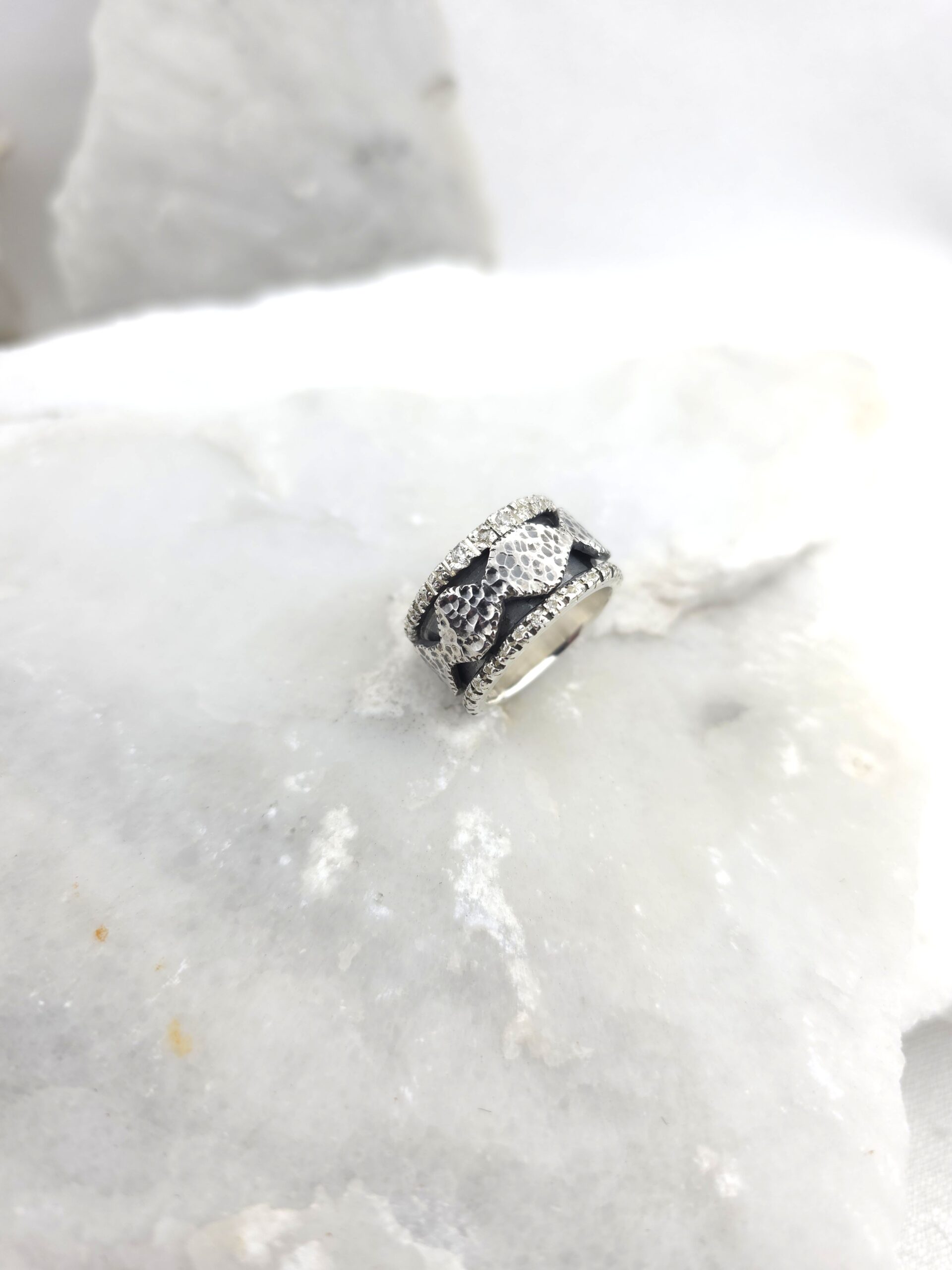 Αυτό το εκπληκτικό δαχτυλίδι είναι κατασκευασμένο από ασήμι 925, με εντυπωσιακή σφυρήλατη υφή και διακοσμημένο από αστραφτερά ζιργκόν. Η λεπτομέρεια του περιστρεφόμενου κεντρικού τμήματος το καθιστά όχι μόνο ένα κομψό statement piece, αλλά και ένα διακριτικό αξεσουάρ για να προσφέρει ανακούφιση από το άγχος. Ένα κόσμημα με μοντέρνα αισθητική, ιδανικό για όλες τις ώρες της ημέρας.