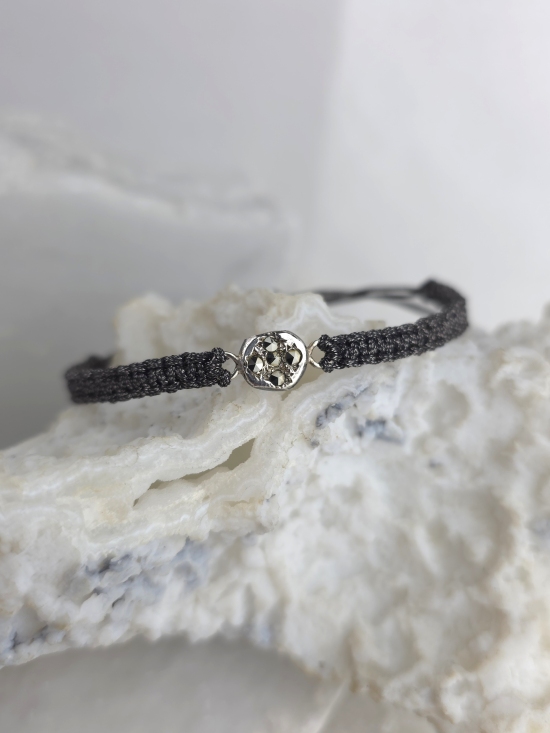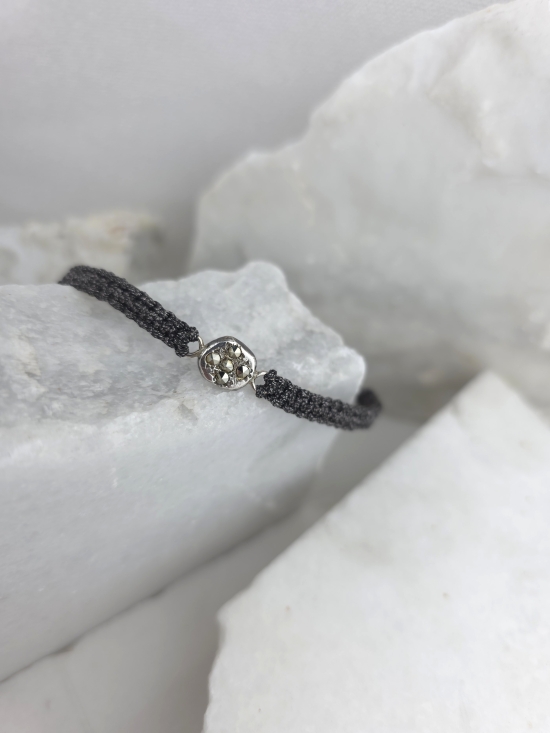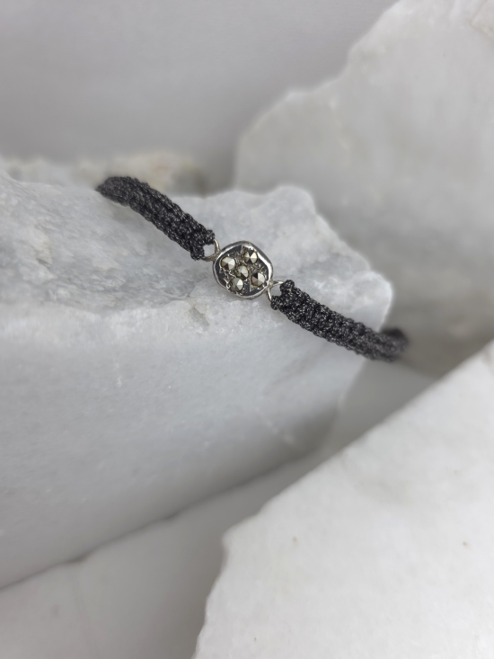 Χειροποίητο βραχιόλι από ασήμι 925 με μαρκασίτη, σε ανθρακί μεταλλικό κορδόνι αυξομείωσης.