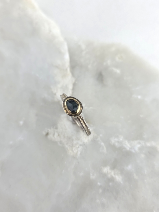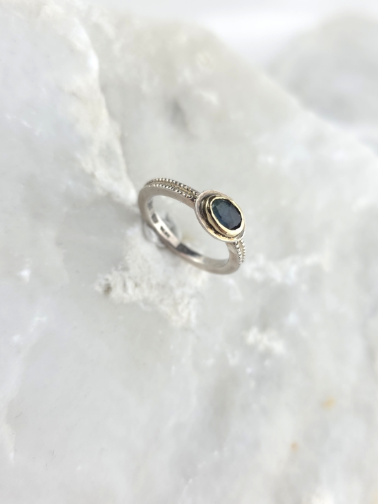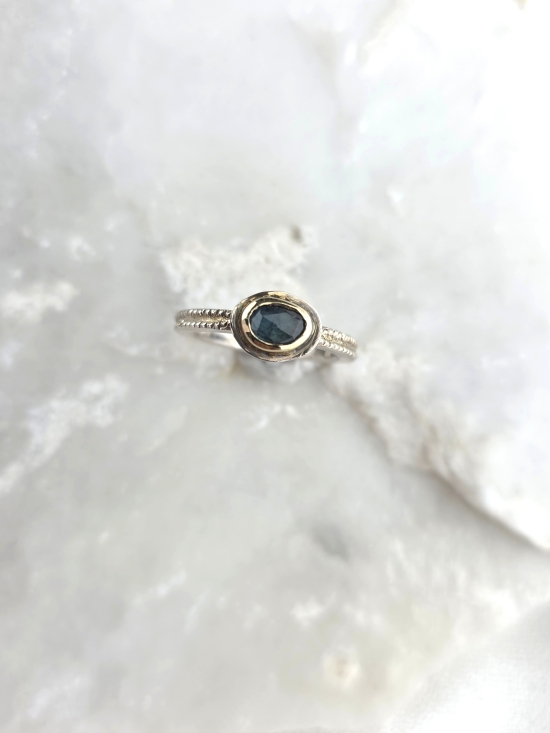 Μοναδικό δαχτυλίδι από ασήμι 925 και χρυσό Κ14 με φυσικό ζαφείρι σε μπλε – πράσινη απόχρωση.