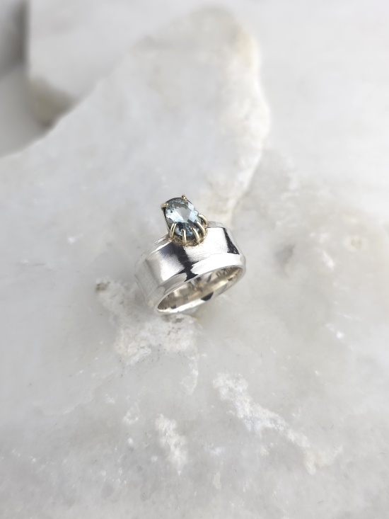 Αναδείξτε το προσωπικό σας στυλ με αυτό το καταπληκτικό δαχτυλίδι από ασήμι 925 και χρυσό Κ14, με φυσική ακουαμαρίνα οβάλ κοπής, με το χαρακτηριστικό γαλάζιο χρώμα της. Ένα τολμηρό σχέδιο με φαρδιά βάση που αναδεικνύει τον κεντρικό λίθο, συνδυάζοντας μοντέρνα αισθητική με κλασική κομψότητα. Αυτό το κόσμημα είναι χειροποίητο και μοναδικό, φτιαγμένο για εσάς που αναζητάτε κάτι ξεχωριστό.