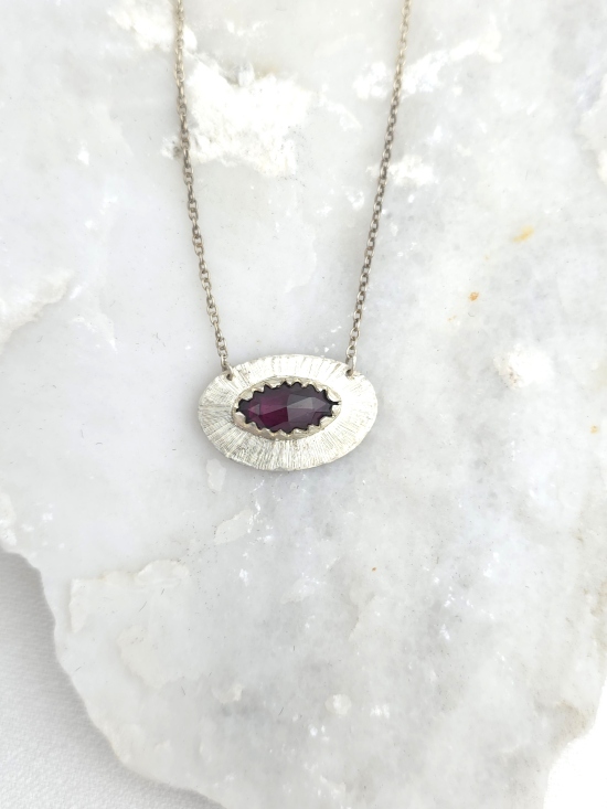 Ένα statement κομμάτι με ρουστίκ γοητεία. Αυτό το χειροποίητο κρεμαστό από ασήμι 925 έχει μοναδική υφή με ιδιαίτερο φινίρισμα και φιλοξενεί έναν εντυπωσιακό γρανάτη στο κέντρο του. Ιδανικό για layering ή ως αυτόνομο, καθημερινό αξεσουάρ.