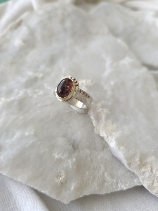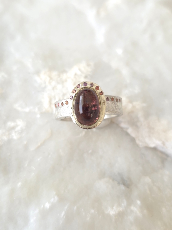 Μοναδικό δαχτυλίδι από ασήμι 925 και χρυσό Κ14, με τουρμαλίνη  σε ροζ – πορτοκαλί απόχρωση και φυσικά πορτοκαλί ζαφείρια.