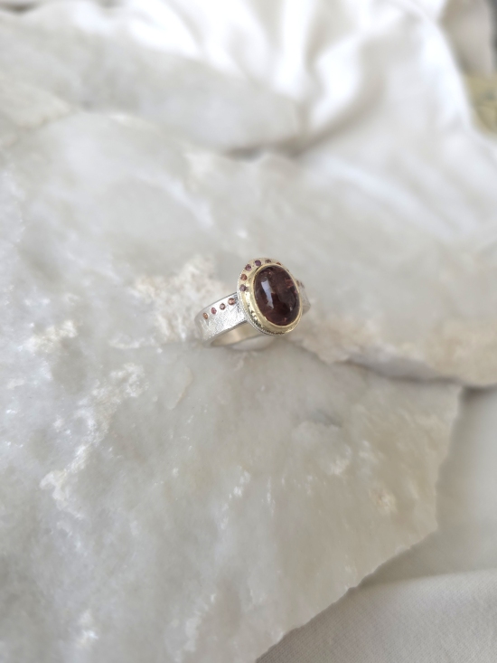 Ανακαλύψτε τη μοναδική γοητεία αυτού του χειροποίητου δαχτυλιδιού από ασήμι 925 και χρυσό Κ14, ένα εξαιρετικό κόσμημα που συνδυάζει τη γήινη ζεστασιά της ροζ-πορτοκαλί τουρμαλίνης με τη διακριτική λάμψη των ζαφειριών. Φτιαγμένο για να μιλάει κατευθείαν στην καρδιά, αυτό το δαχτυλίδι είναι μια ωδή στην ομορφιά της σύνδεσης.