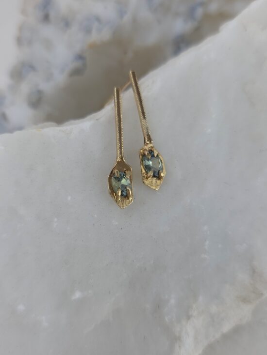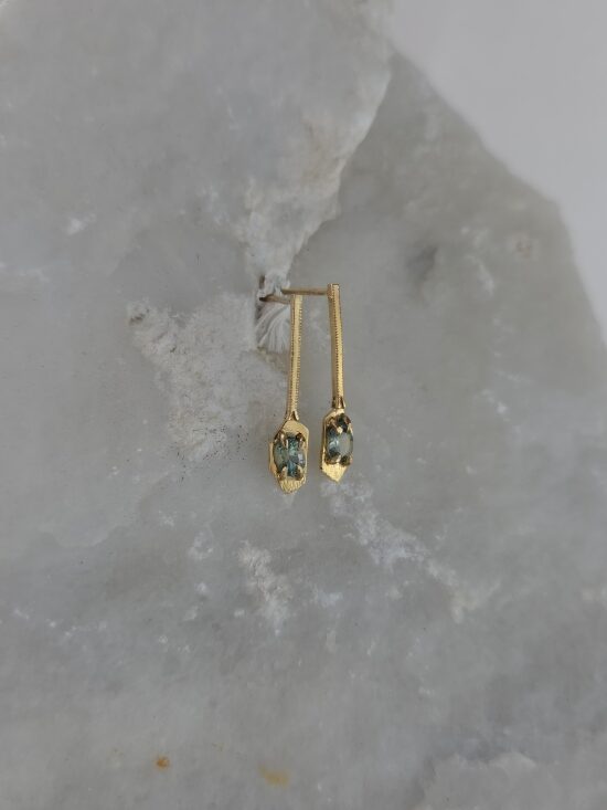 Διαχρονικά χρυσά σκουλαρίκια από χρυσό Κ14, με φυσικά γαλαζοπράσινα ζαφείρια Μαδαγασκάρης.