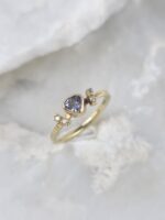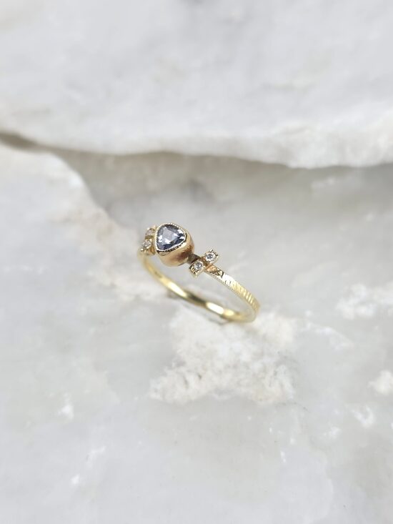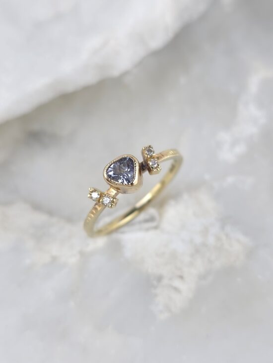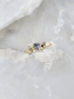 Αυτό το κομψό δαχτυλίδι σε χρυσό Κ14 είναι ιδανικό για να προσθέσει μια διακριτική πινελιά λάμψης στην καθημερινότητά σας. Η κεντρική πέτρα είναι ένα εντυπωσιακό φυσικό ζαφείρι σε μπλε – μοβ απόχρωση, το οποίο πλαισιώνεται από μικρότερα διαμάντια δεξιά και αριστερά, προσδίδοντας έναν αέρα ρομαντισμού. Ένα ιδανικό δώρο για να γιορτάσετε μία νέα αρχή, μία αγάπη που ανθίζει ή να σφραγίσετε την παντοτινή σας αγάπη.