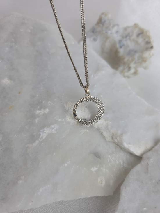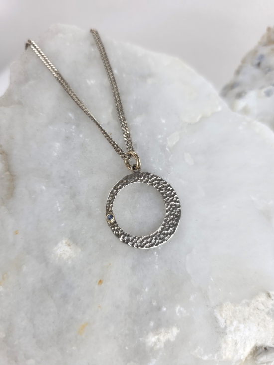 Προσθέστε μια πινελιά κομψότητας με αυτό το εντυπωσιακό σφυρήλατο κρεμαστό από ασήμι 925 και χρυσό Κ14, με διακριτικό φυσικό μπλε ζαφείρι.