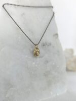 Αυτό το χειροποίητο, ανάγλυφο κρεμαστό κατασκευασμένο από χρυσό Κ14, αγκαλιάζει ένα λαμπερό διαμάντι, δημιουργώντας μια αντίθεση που μαγνητίζει. Η αντικέ αισθητική του και η οξειδωμένη αλυσίδα προσδίδουν έναν μοναδικό, σύγχρονο χαρακτήρα. Ένα κόσμημα-δήλωση που συνδυάζει την πολυτέλεια του χρυσού και του διαμαντιού με τη γήινη, οργανική ομορφιά. Φορέστε το μόνο του για minimal κομψότητα ή συνδυάστε το με άλλα κρεμαστά για ένα εντυπωσιακό layering.