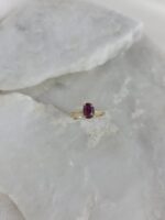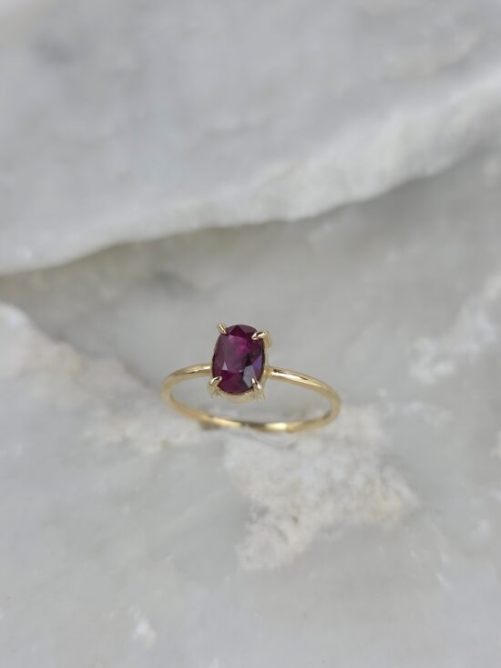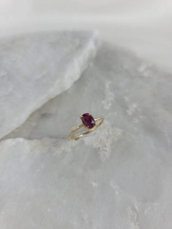 Αυτό το εκθαμβωτικό δαχτυλίδι είναι μία ωδή στη διαχρονική κομψότητα και το πάθος. Κατασκευασμένο από χρυσό Κ14 με έναν λιτό και διαχρονικό σχεδιασμό, ο οποίος εστιάζει στην ανάδειξη της πέτρας. Στο κέντρο δεσπόζει ένα εντυπωσιακό, οβάλ κοπής φυσικό ρουμπίνι σε ζωηρό κόκκινο χρώμα που παραπέμπει στο πάθος και την πολυτέλεια. Ο συνδυασμός του θερμού χρυσού με το έντονο χρώμα της πέτρας δημιουργεί μια αρμονική και κομψή αντίθεση. Ο μινιμαλιστικός σχεδιασμός το καθιστά κατάλληλο για κάθε γυναίκα που εκτιμά την κλασική ομορφιά και τη διαχρονική αξία.
