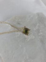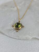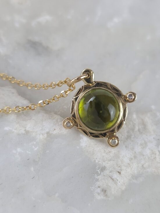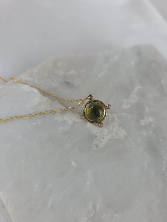 Ανακαλύψτε τη διαχρονική κομψότητα με αυτό το χειροποίητο κρεμαστό από χρυσό Κ14. Στην καρδιά του κοσμήματος βρίσκεται ένα φωτεινό, οβάλ περίδοτο σε έντονη λαδοπράσινη απόχρωση, ένας λίθος που από την αρχαιότητα θεωρούνταν σύμβολο του ήλιου και της ευημερίας, το οποίο συνδυάζεται αρμονικά από διακριτικά διαμάντια στη βάση του. Το μοναδικό του χρώμα και η λάμψη του προσδίδουν φρεσκάδα, καθιστώντας το ιδανικό για να προσθέσει μια νότα πολυτέλειας και θετικής ενέργειας στην καθημερινότητά σας.