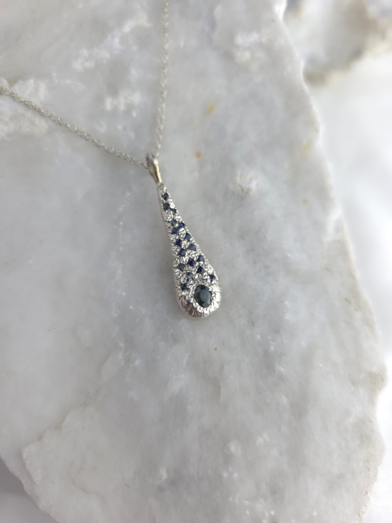 Εντυπωσιακό κρεμαστό από ασήμι 925 με φυσικά μπλε ζαφείρια. Συνοδεύεται από αλυσίδα από ασήμι 925.