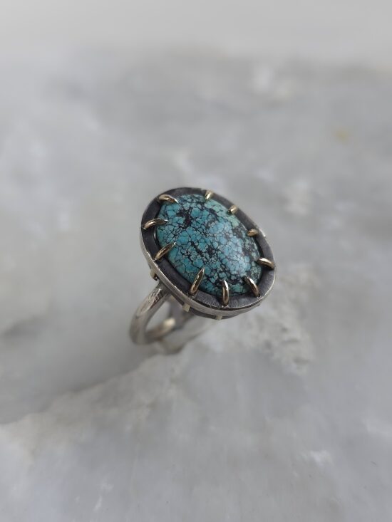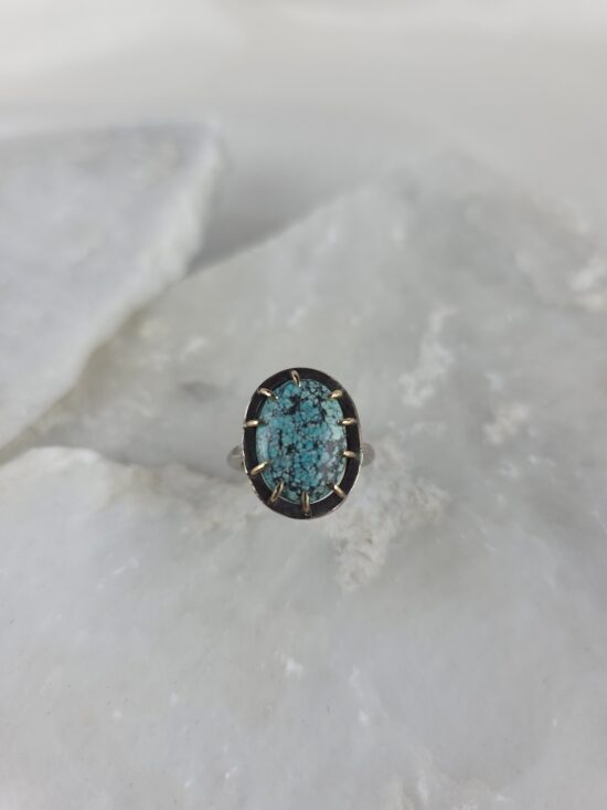 Αυτό το εντυπωσιακό χειροποίητο δαχτυλίδι σε ασήμι 925 και χρυσό Κ14, διαθέτει μία κεντρική οβάλ πέτρα τιρκουάζ, η οποία πλαισιώνεται από ένα ιδιαίτερο περίβλημα με χρυσές λεπτομέρειες. Το στυλ του δαχτυλιδιού παραπέμπει σε χειροποίητα κοσμήματα με έθνικ ή vintage επιρροές, ενώ ο συνδυασμός του οξειδωμένου μετάλλου με το φωτεινό χρώμα της πέτρας δημιουργεί μια εντυπωσιακή αντίθεση, καθιστώντας το κόσμημα ένα μοναδικό κομμάτι που ξεχωρίζει.
